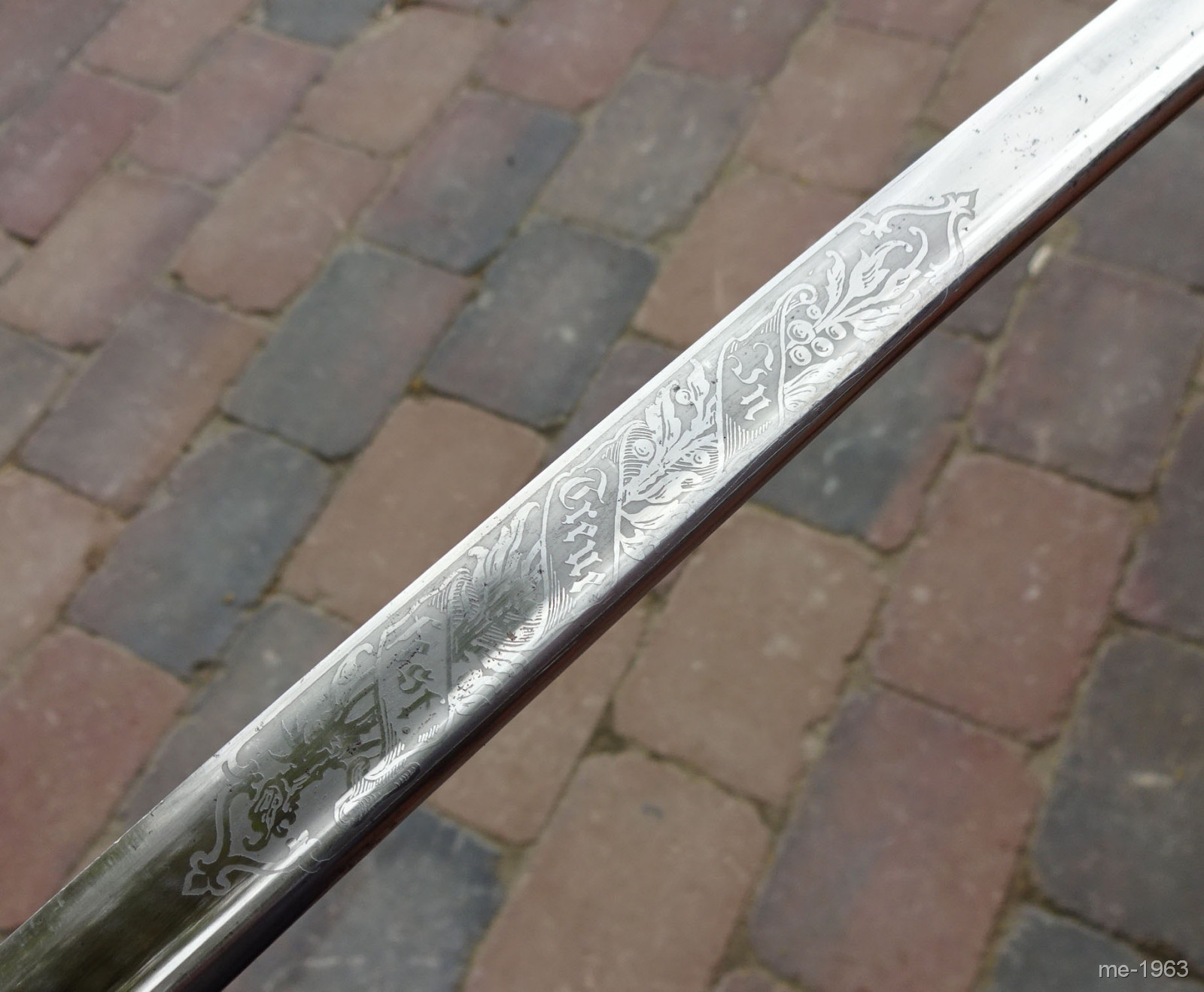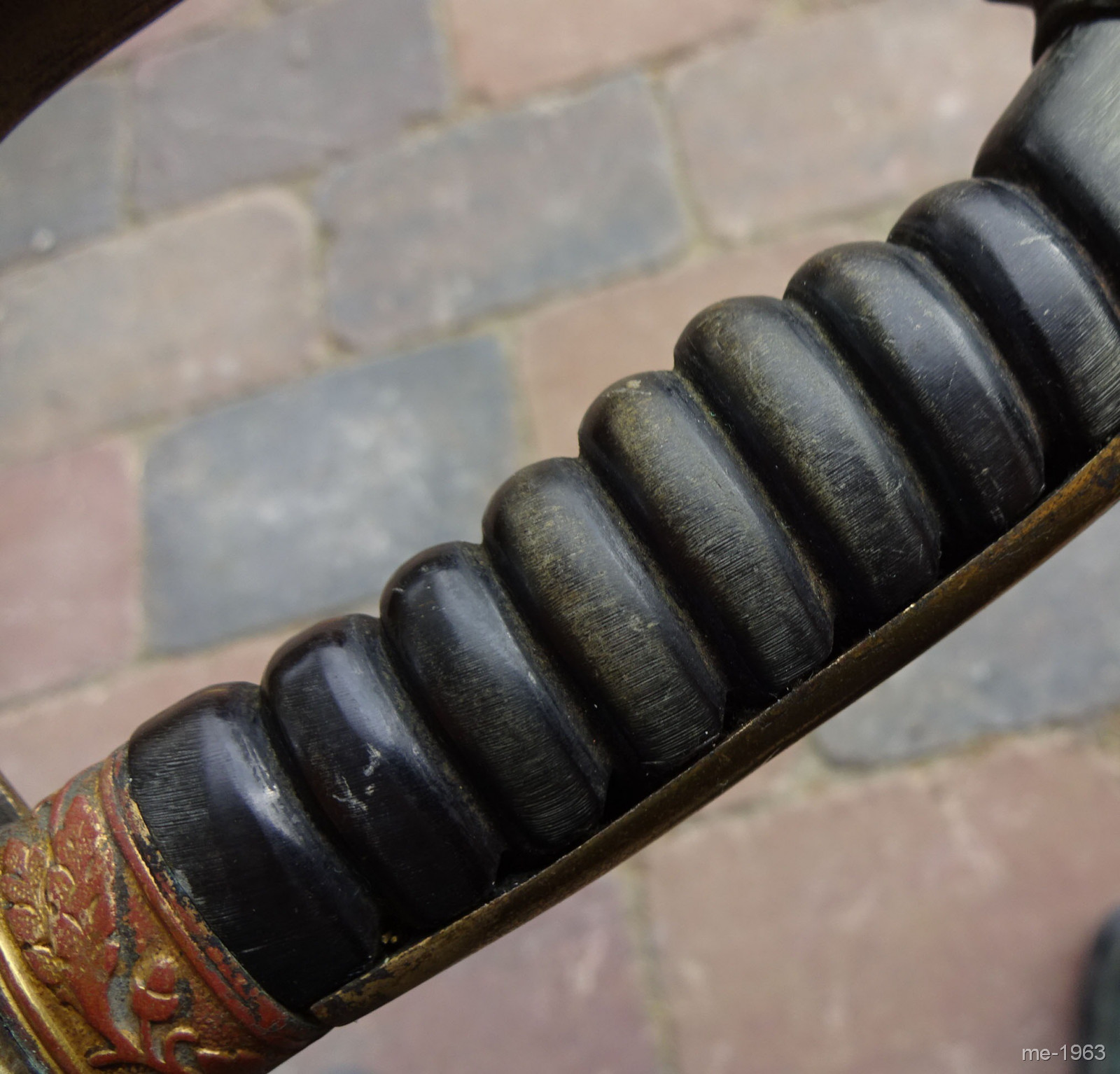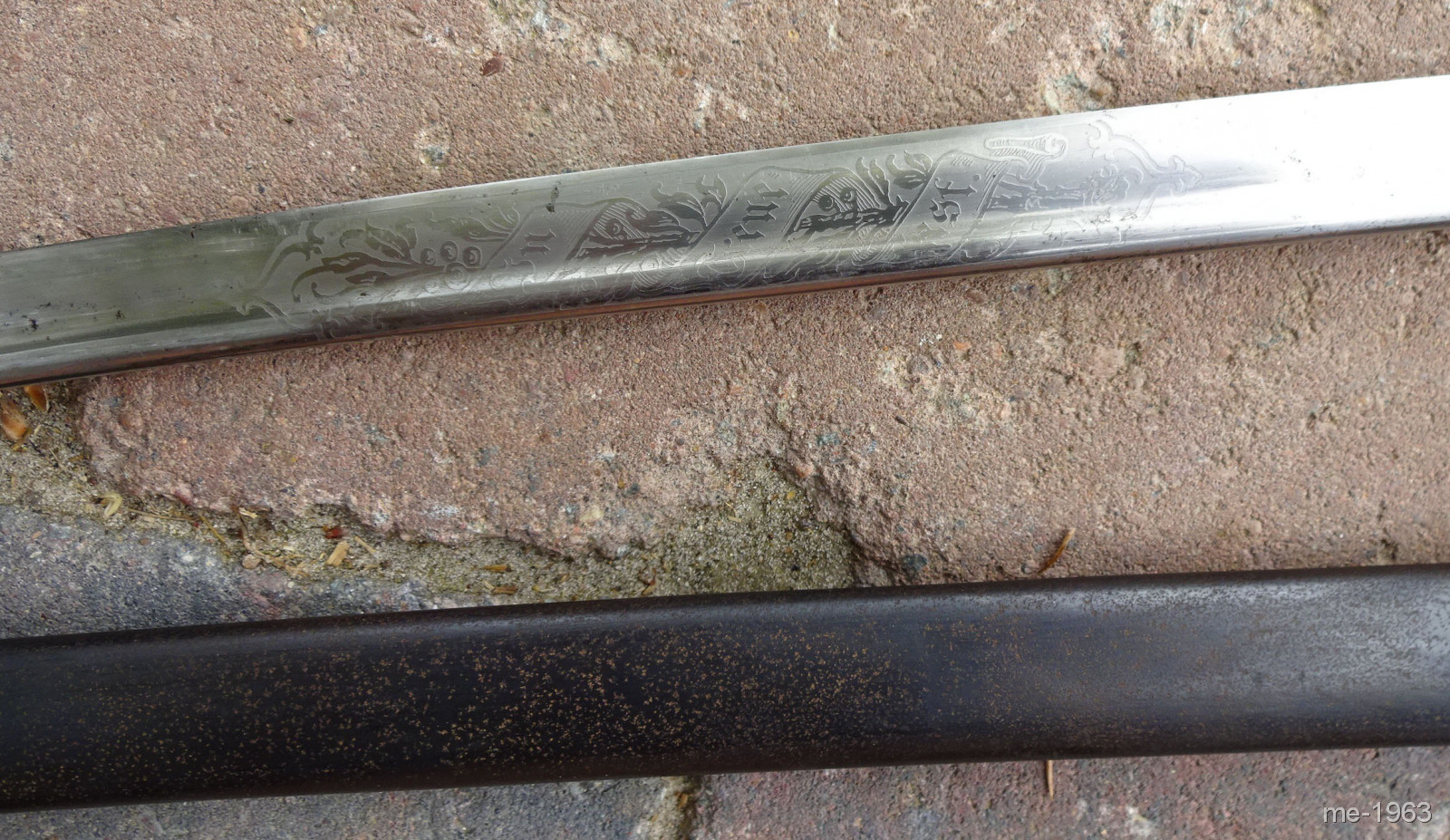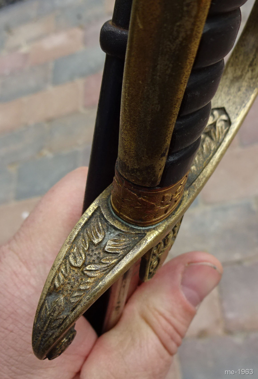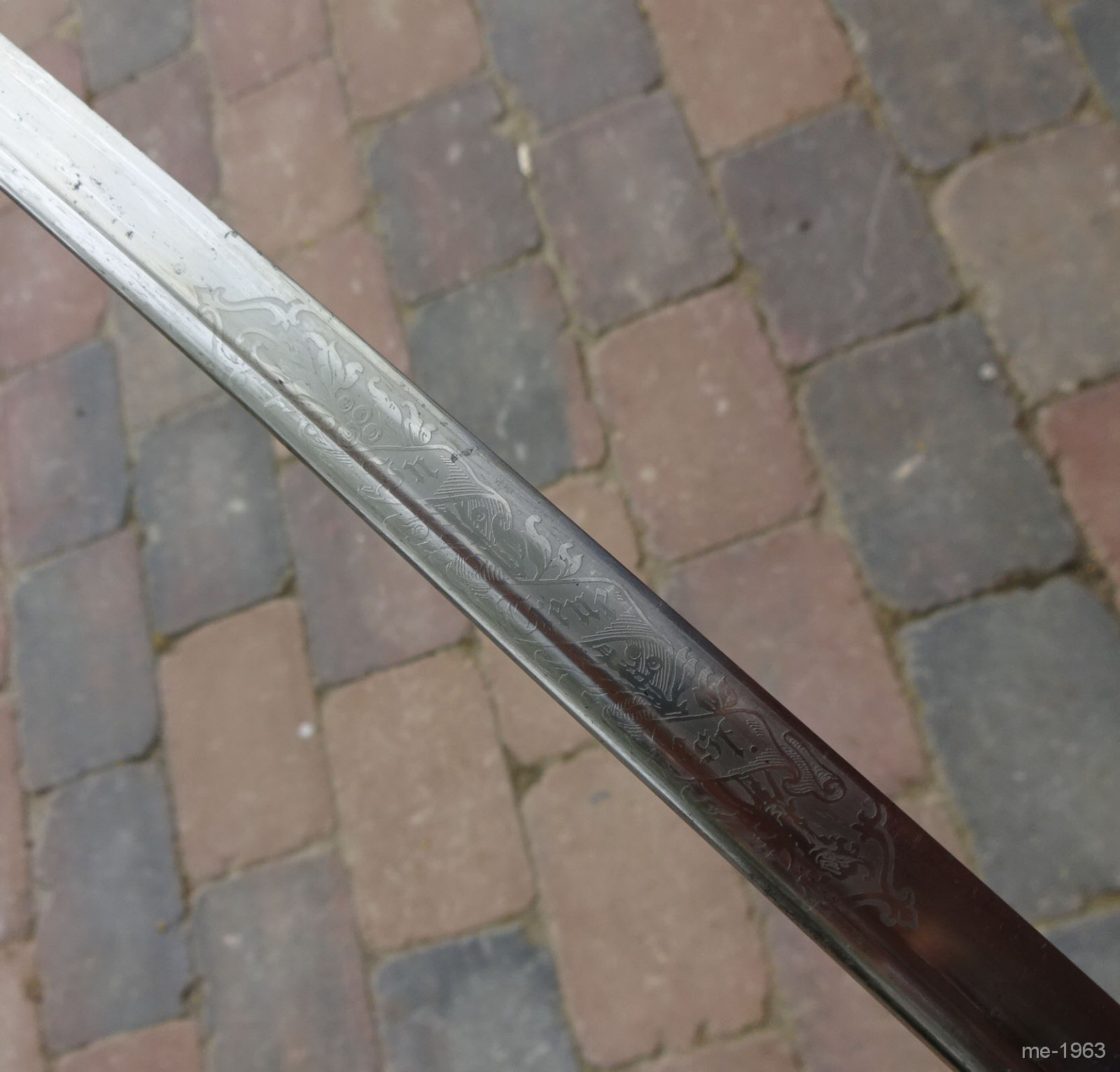 kpl. 97 cm lang-Horngriff-Wicklung fehlt- Klinge Steckrücken-im unteren Bereich teils narbig- beidseitig Devise geätzt-Hersteller nicht erkennbar- eingestichelt Z-brünierte Scheide