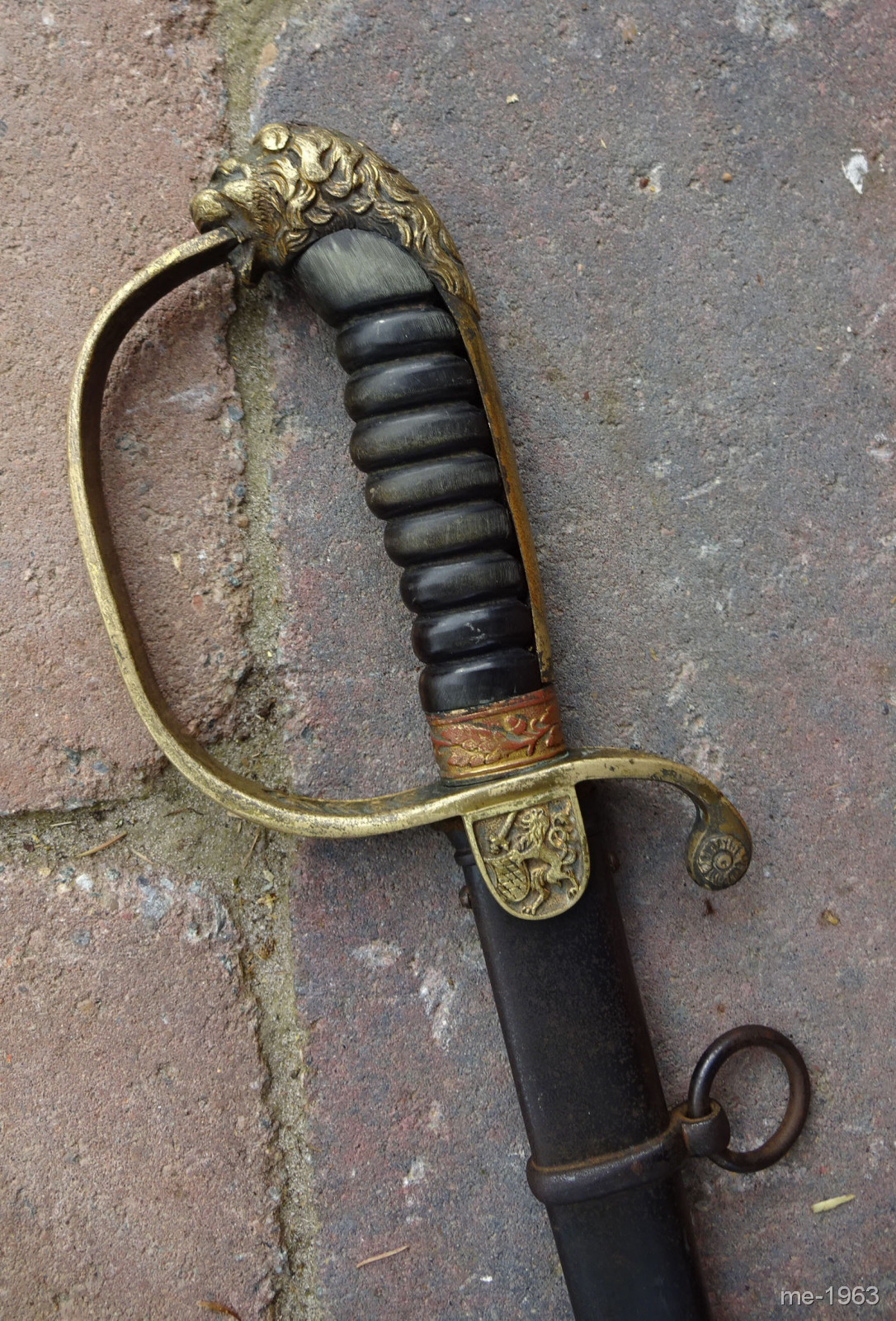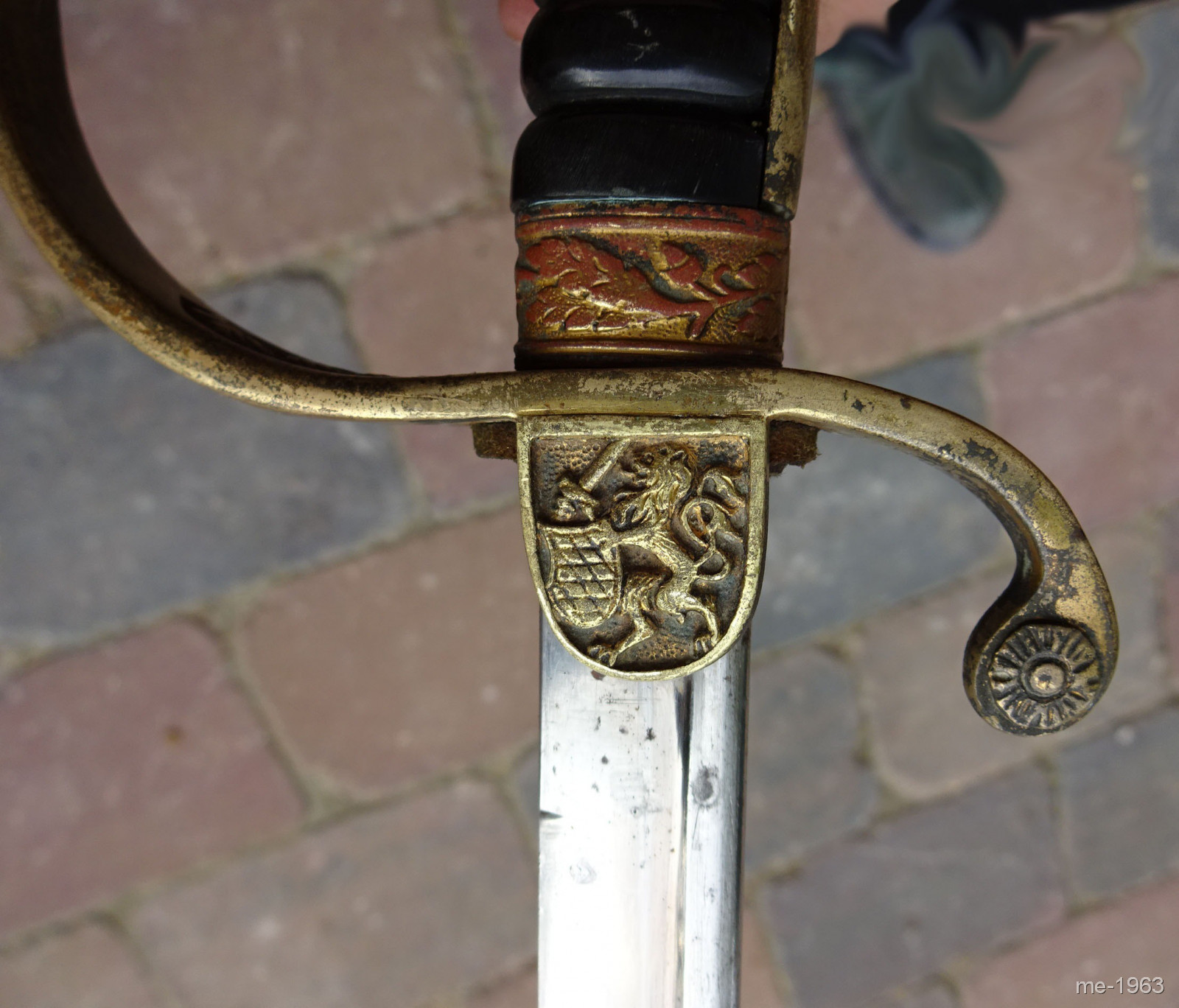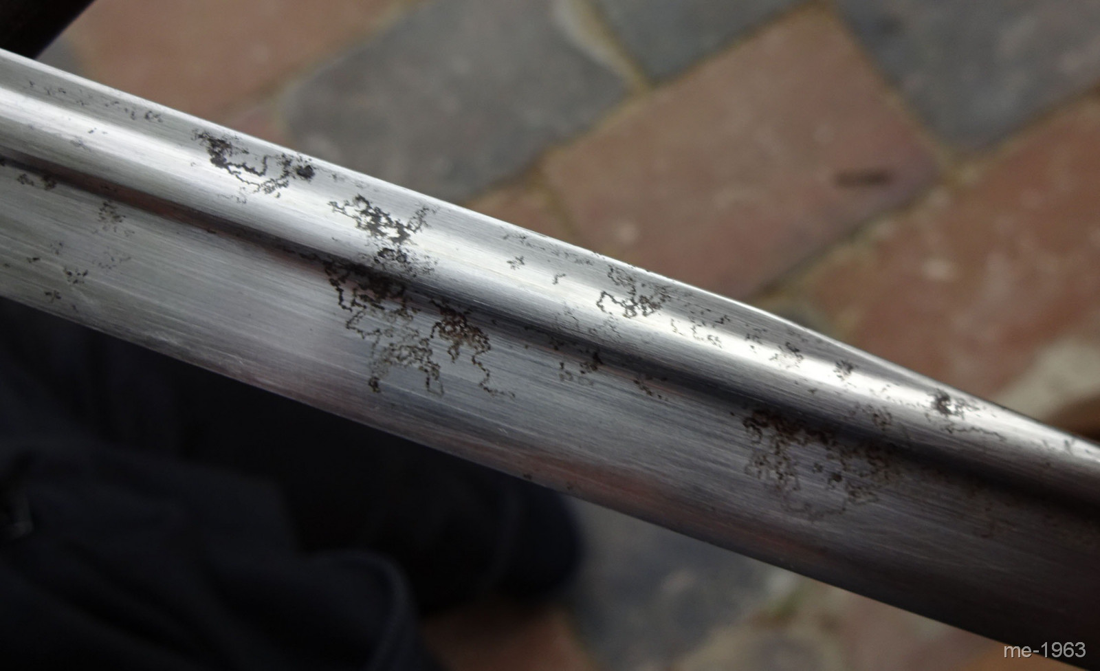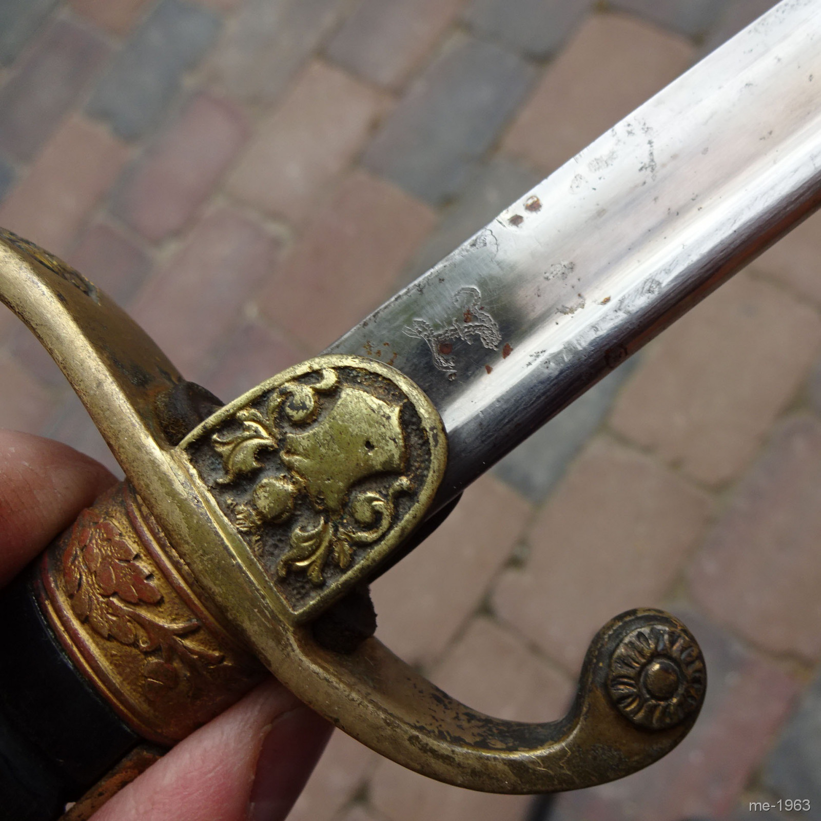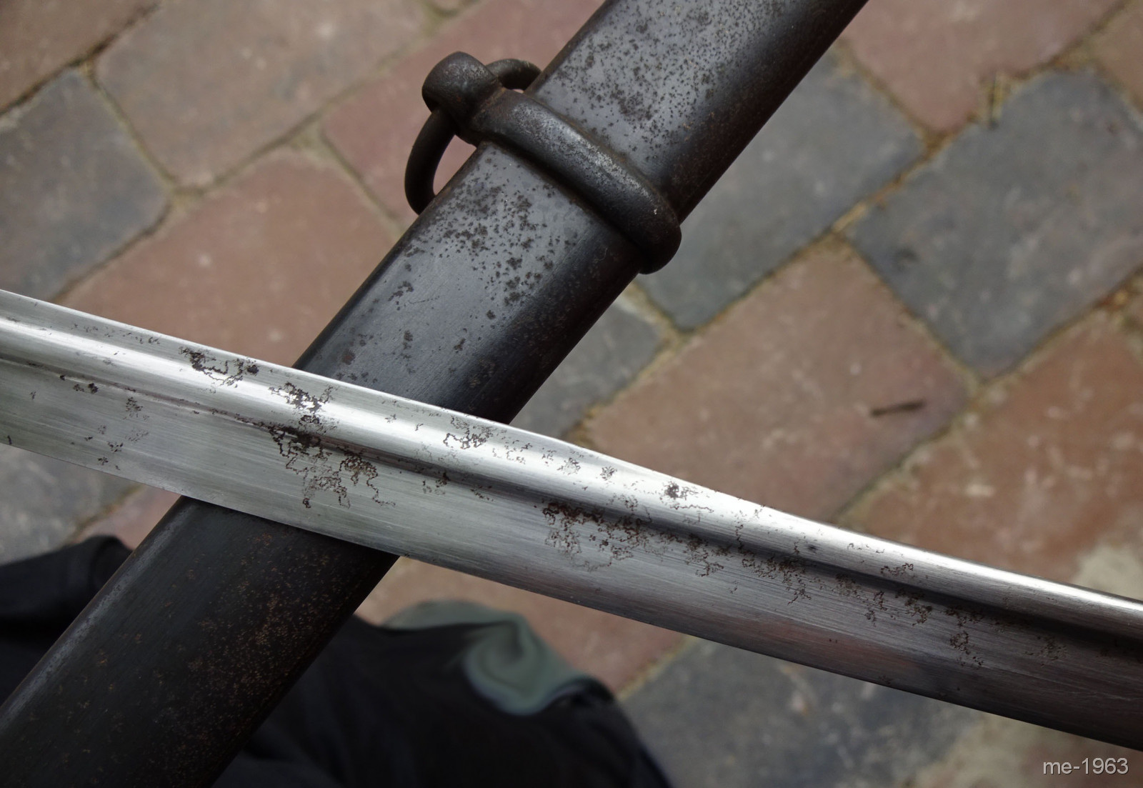 kpl. 97 cm lang-Horngriff-Wicklung fehlt- Klinge Steckrücken-im unteren Bereich teils narbig- beidseitig Devise geätzt-Hersteller nicht erkennbar- eingestichelt Z-brünierte Scheide
