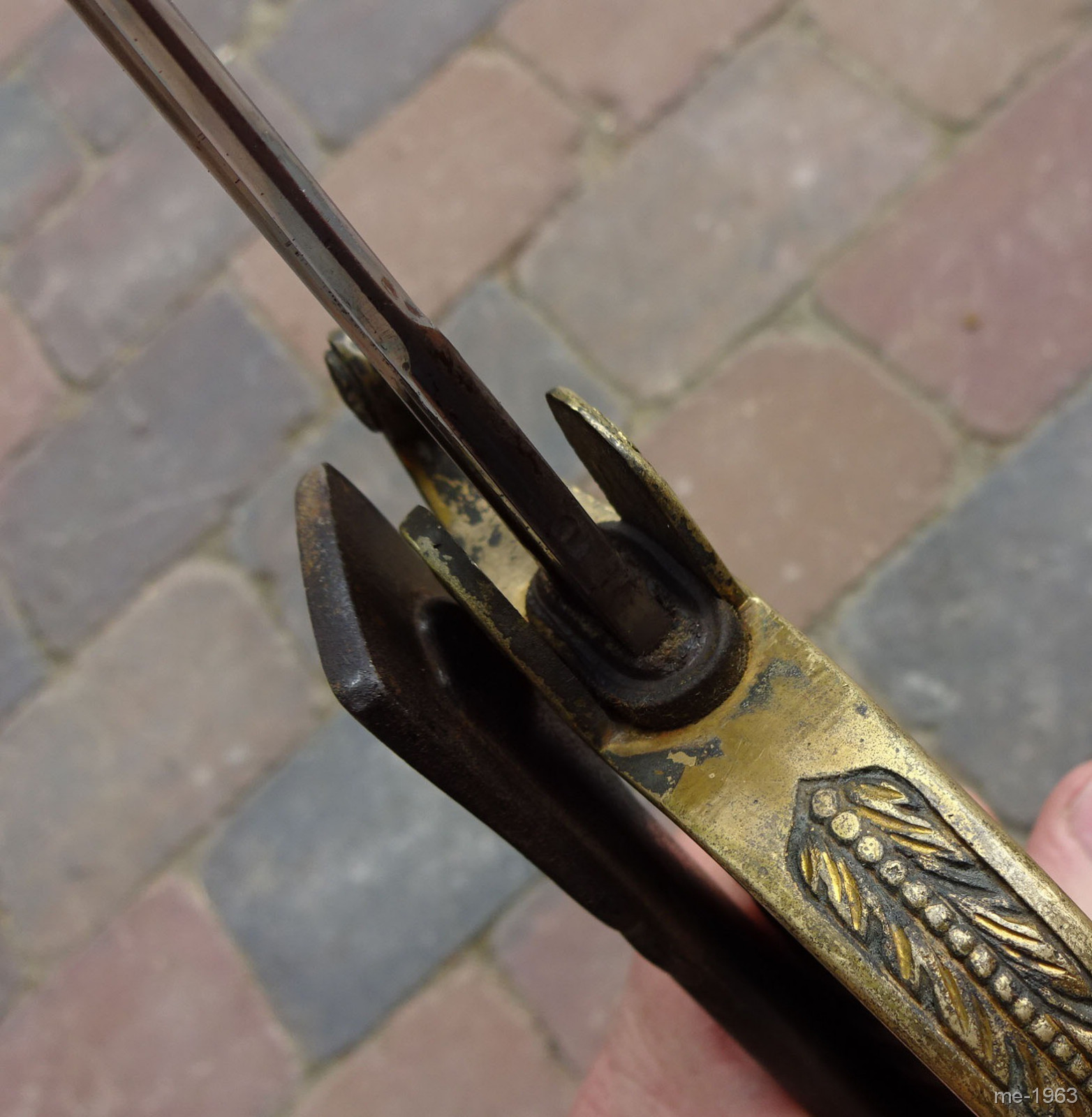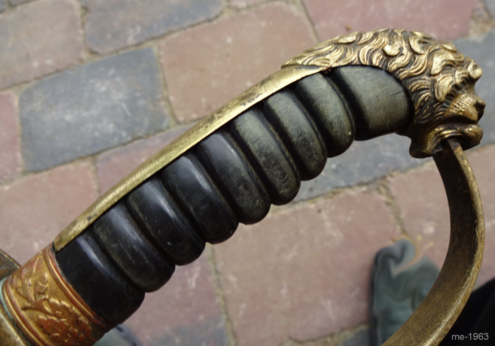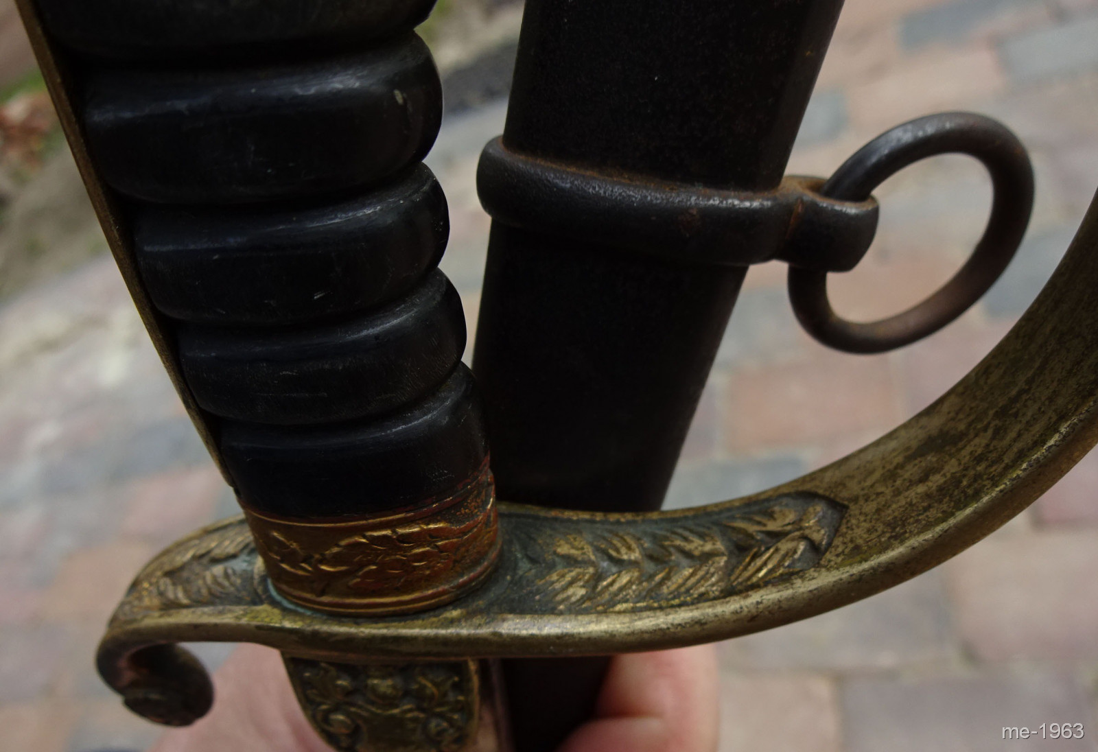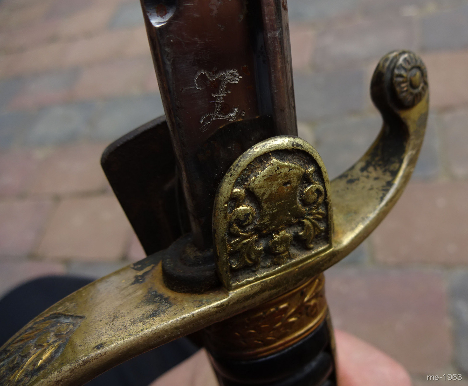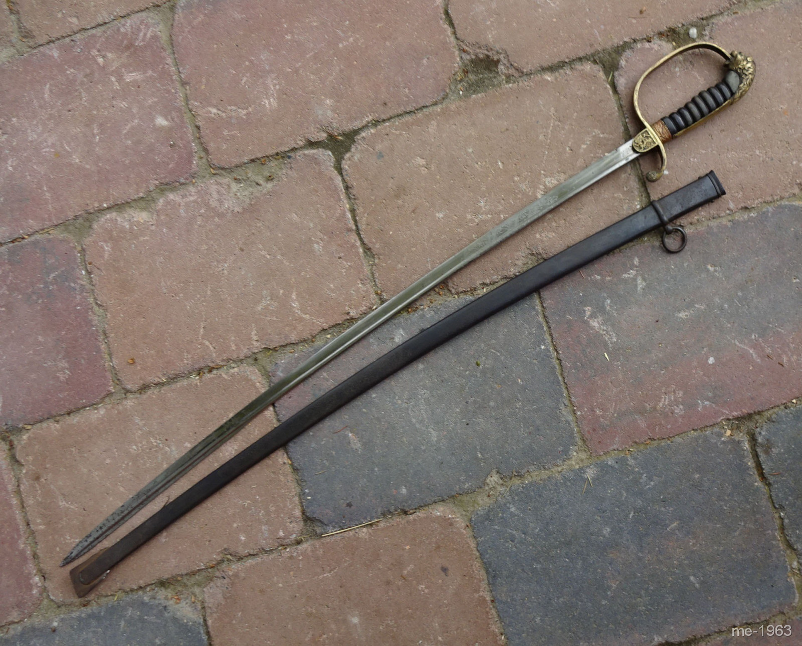 kpl. 97 cm lang-Horngriff-Wicklung fehlt- Klinge Steckrücken-im unteren Bereich teils narbig- beidseitig Devise geätzt-Hersteller nicht erkennbar- eingestichelt Z-brünierte Scheide