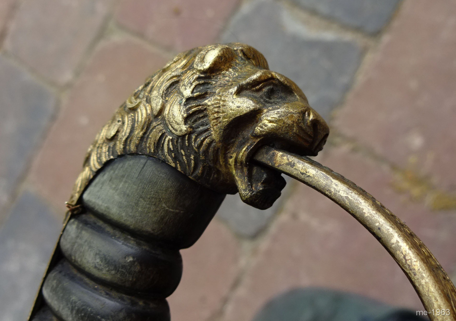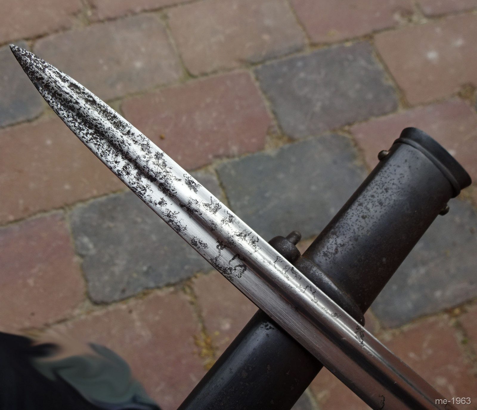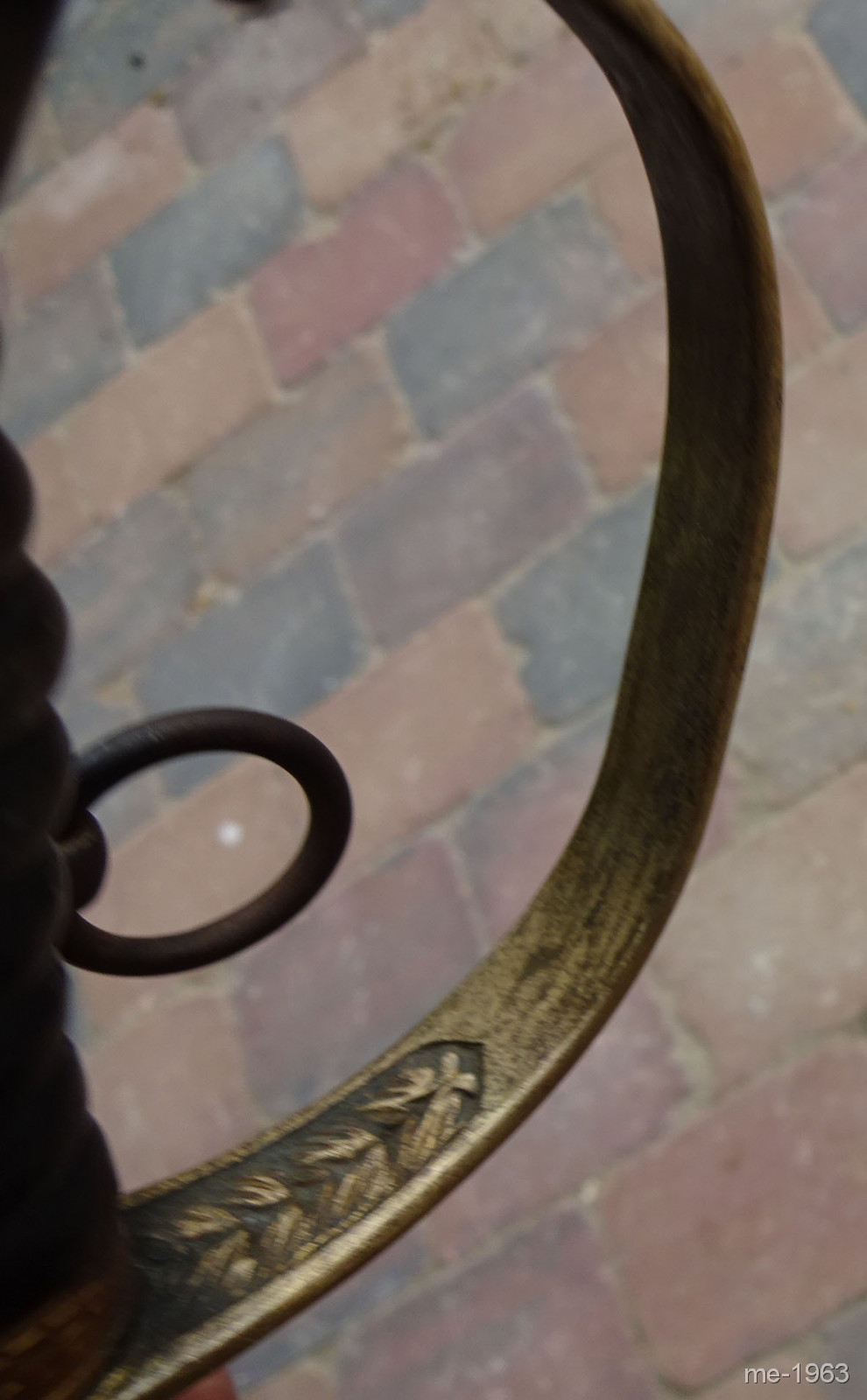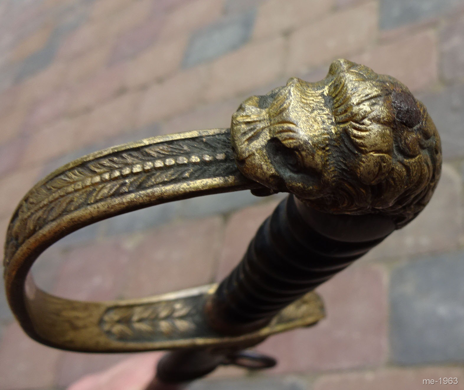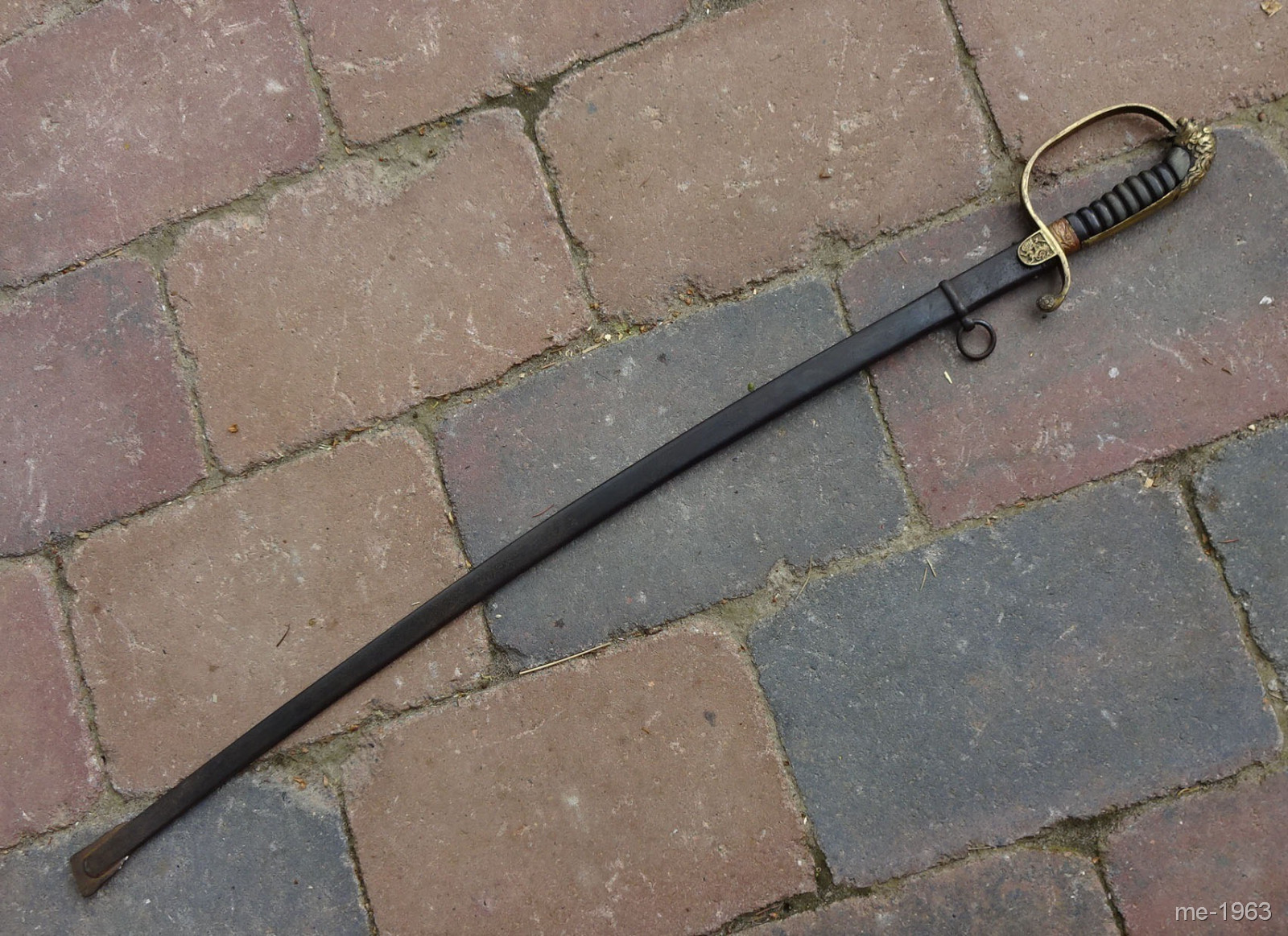 kpl. 97 cm lang-Horngriff-Wicklung fehlt- Klinge Steckrücken-im unteren Bereich teils narbig- beidseitig Devise geätzt-Hersteller nicht erkennbar- eingestichelt Z-brünierte Scheide